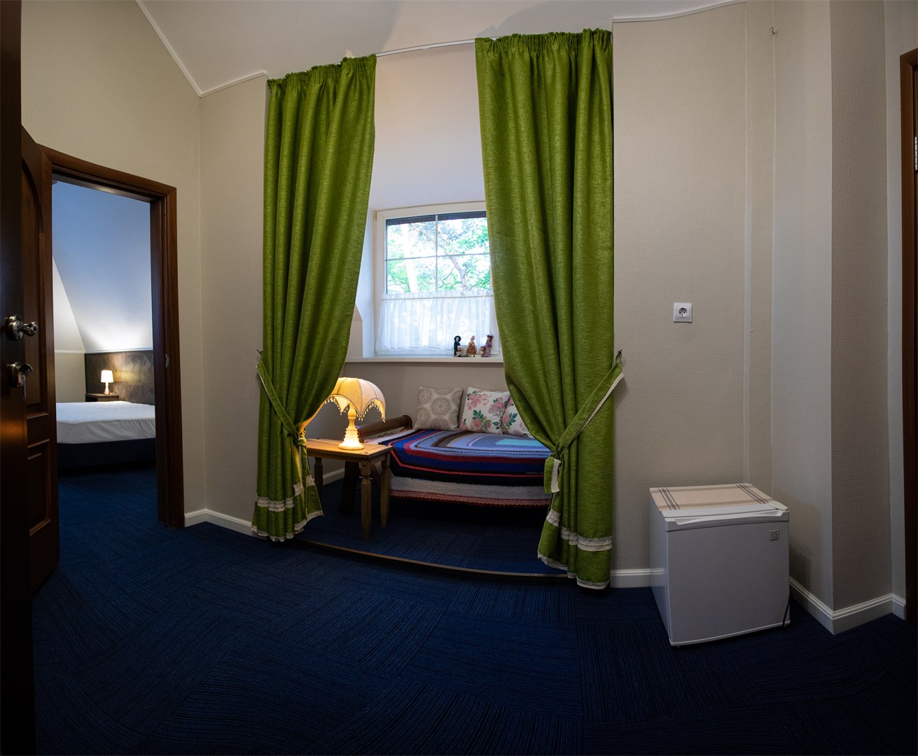 - Люкс. Двухкомнатный семейный Люкс (мансарда). Осн. мест: 2. Доп. мест: 1.