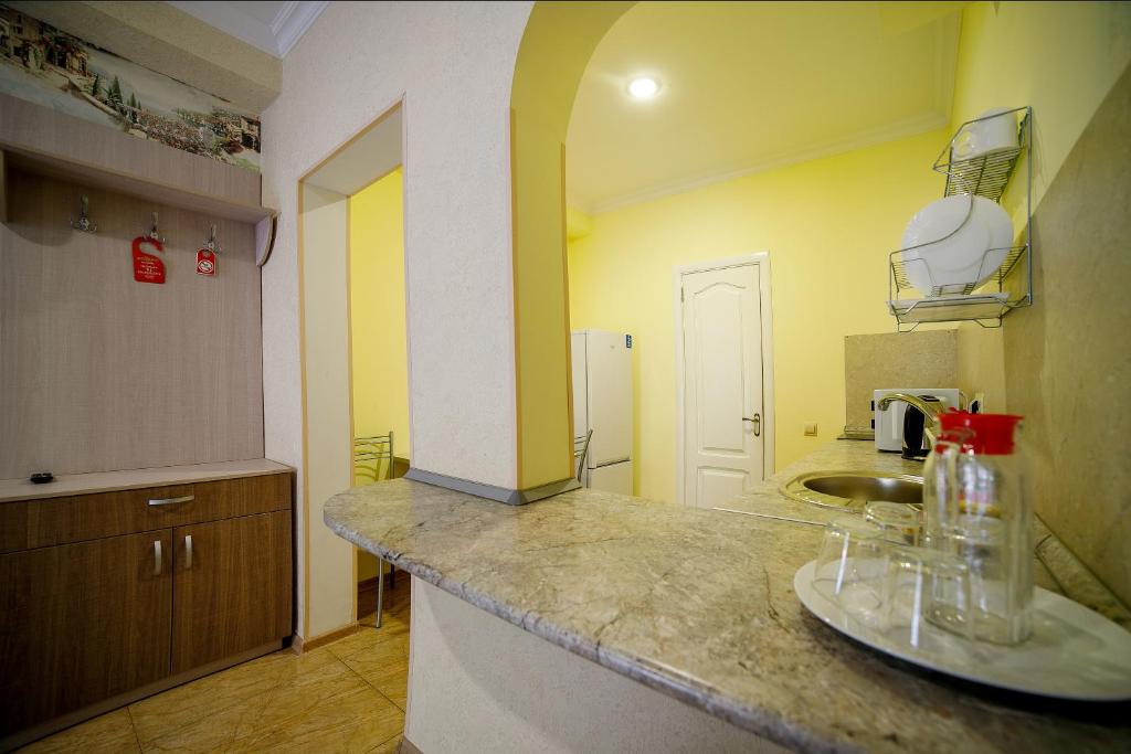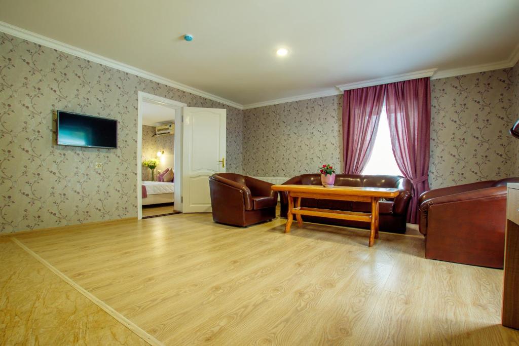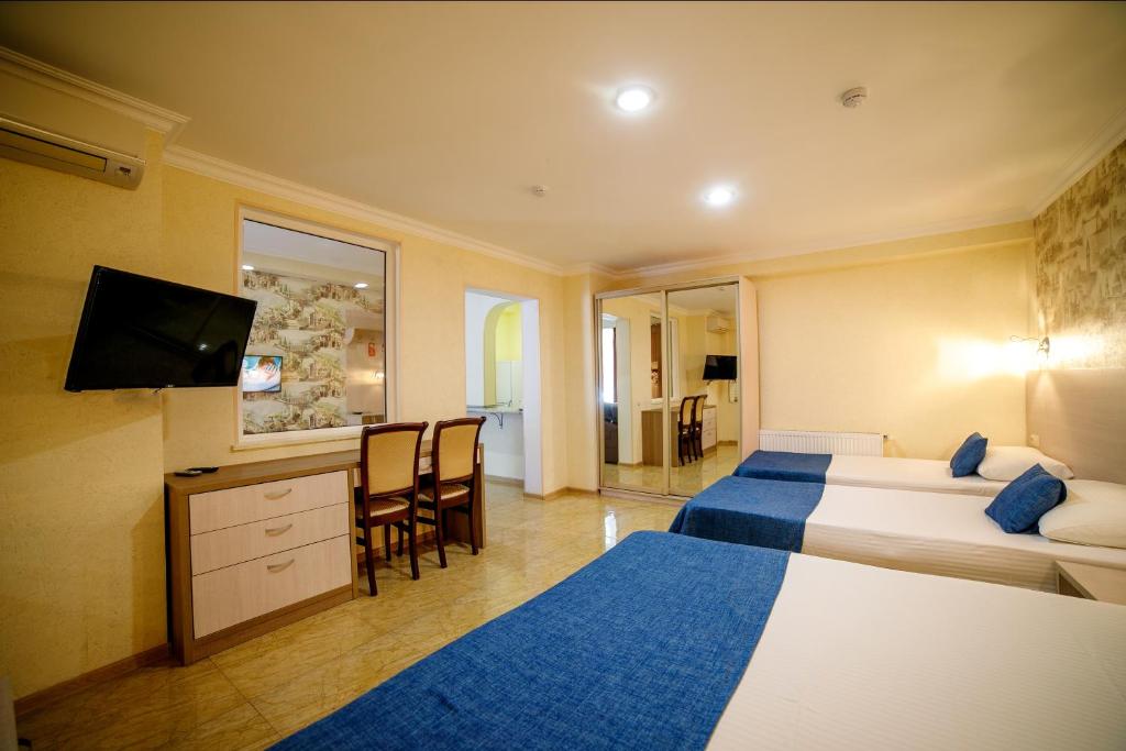 Небольшое здание отеля разместилось на благоустроенной закрытой территории. Гостей ожидают просторные номера категории Стандарт, Студио, Семейный, Люкс и вместительные четырехместные апартаменты. Во всех номерах помимо удобного мебельного гарнитура, установлена сплит-система, есть сейф, телевизор, собственный санузел с ванной или душевой кабиной, в апартаментах и семейных номерах оборудованный кухонный уголок.