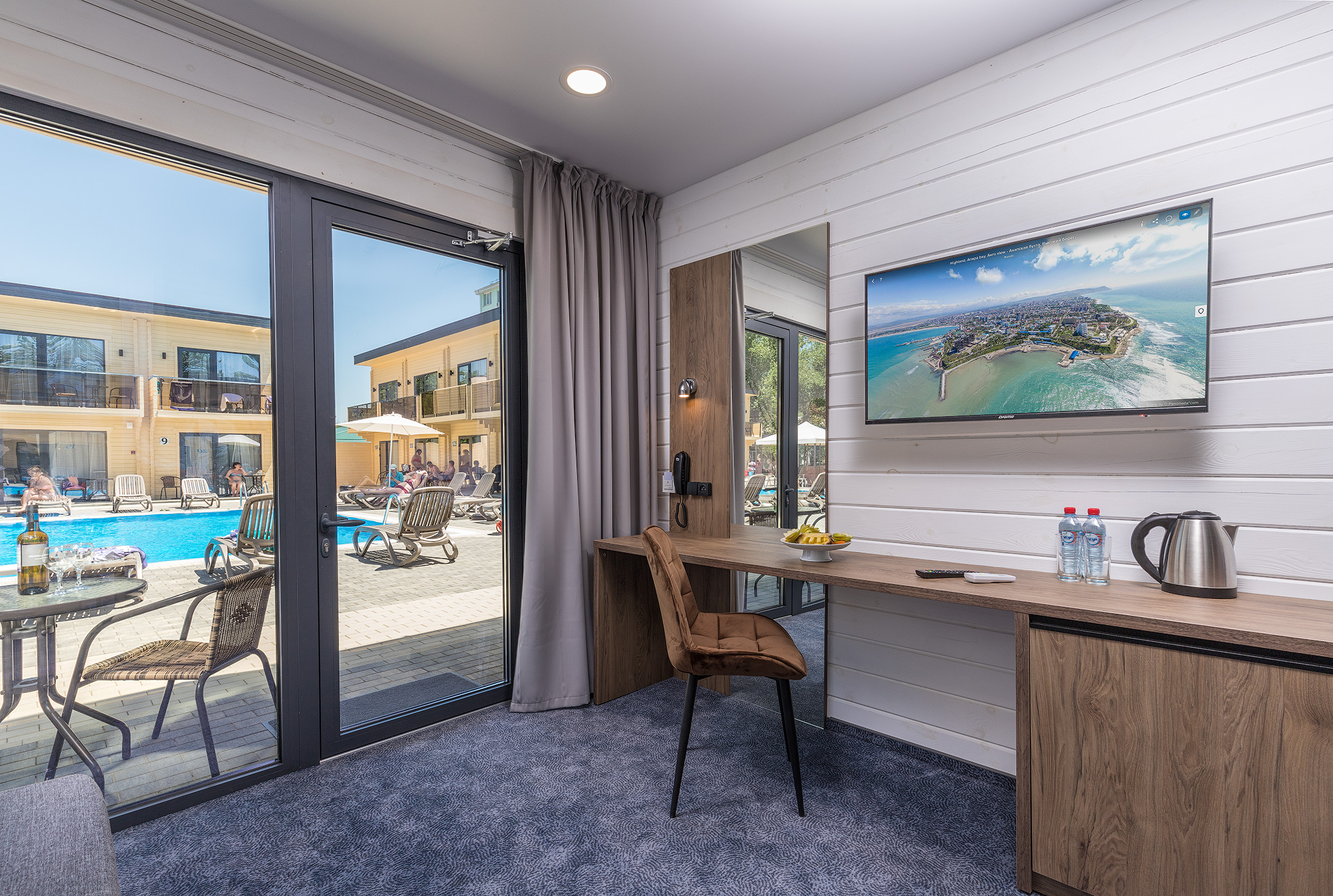 В распоряжении гостей комплекса два открытых плавательных бассейна: один, размером 20 на 13 метров для коттеджей, второй, 25 на 15 метров для остальных корпусов. Для любителей активно отдыха предусмотрены спортивные площадки теннисный корт. На территории хорошо ловит сеть wi-fi, для автовладельцев предусмотрена охраняемая парковка. Малышам отель предоставляет кроватки-манежи и стульчики для кормления, также есть уличная площадка с горками и отделение для детей в общем бассейне.
