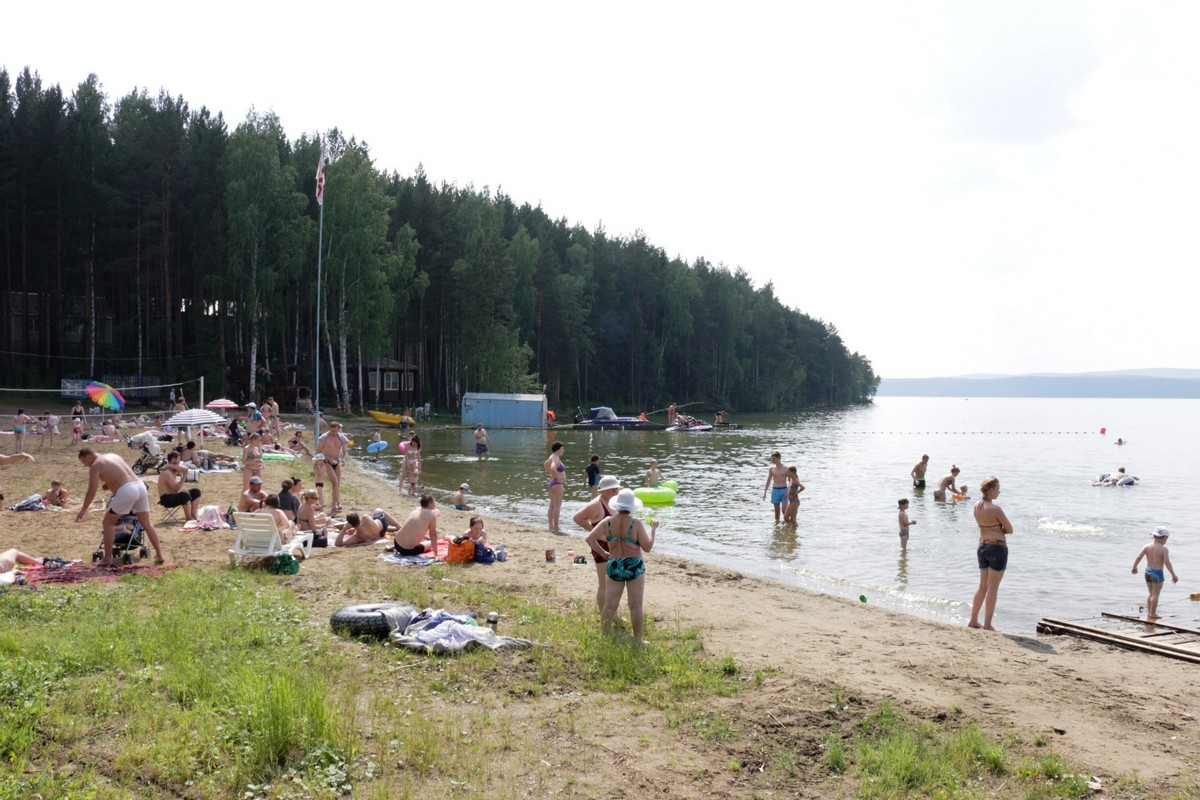 В теплое время года гости могут отдохнуть на пляже, расположенном на берегу озера в шаговой доступности от домиков.