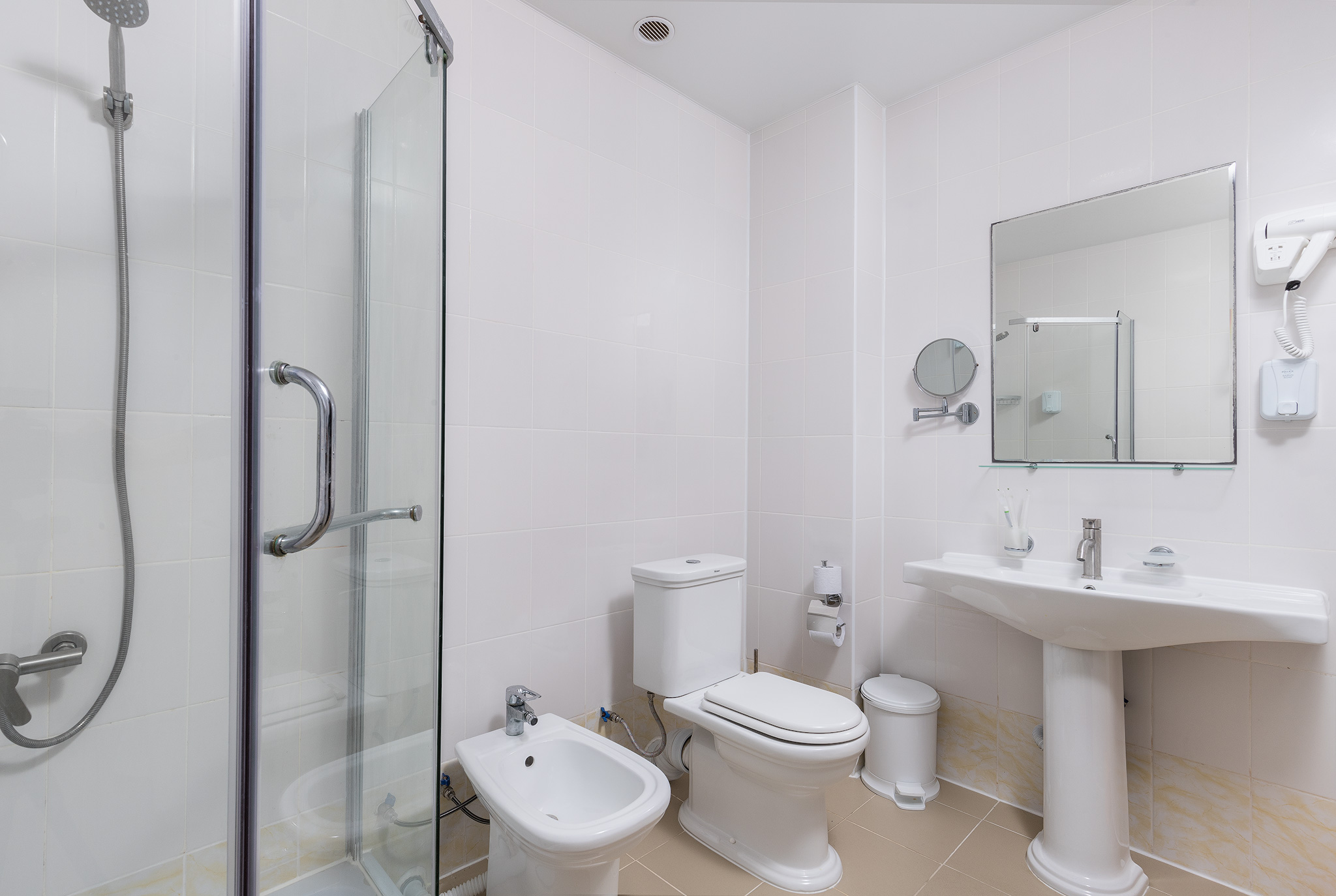с душевой кабиной: ; тапочки: ; туалетные принадлежности: ; фен: ; халат: ;