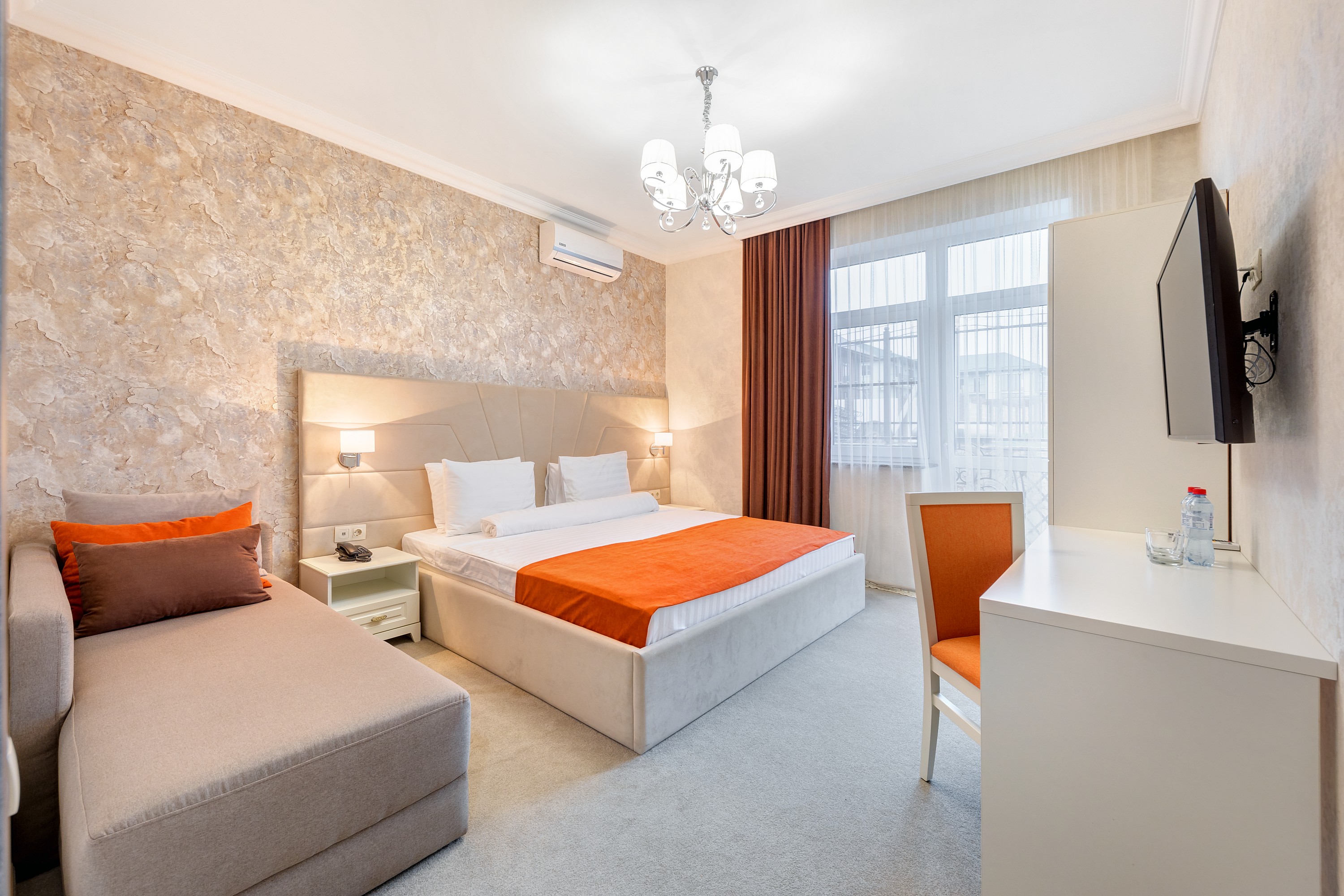 На благоустроенной закрытой территории отеля разместилось несколько трехэтажных кирпичных корпусов с номерами разных категорий комфорта. В общей сложности жилой фонд вмещает в себя 67 однокомнатных и двухкомнатных номеров. В номерах светлые современные интерьеры, везде имеется индивидуальный санузел с душем и набором косметических принадлежностей для отдыхающих, есть сплит-система и необходимая техника — электрочайник, плазменный телевизор, мини-холодильник, фен.