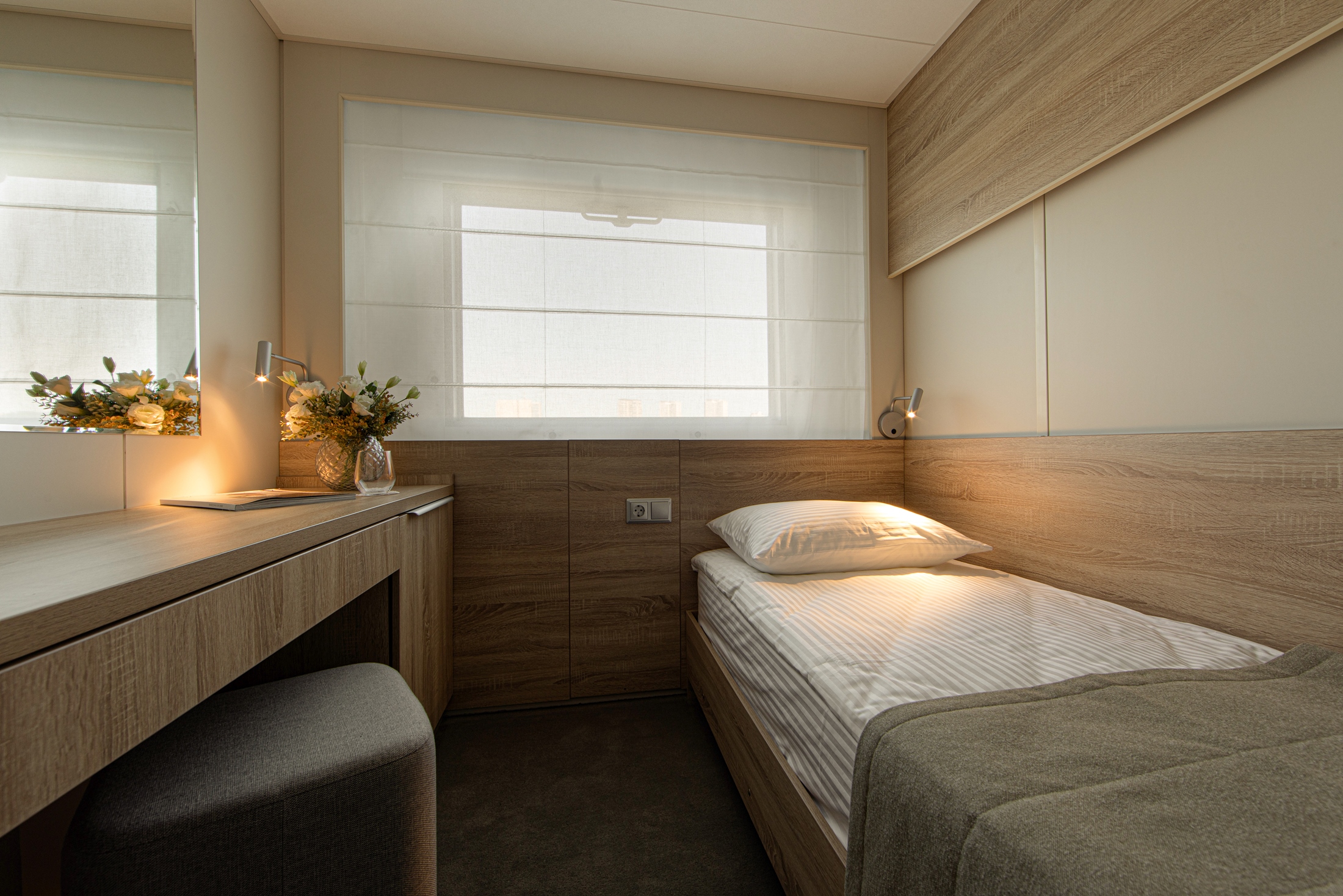 | Двухместная одноярусная: | Однокомнатная одноярусная каюта, рассчитанная на размещение двух человек В каюте: два спальных места (не сдвигаются), шкаф для одежды, радио, кондиционер, душ, санузел, холодильник, телевизор, фен, обзорное окно, электророзетка на 220V, площадь кают до 9,1 м2. |