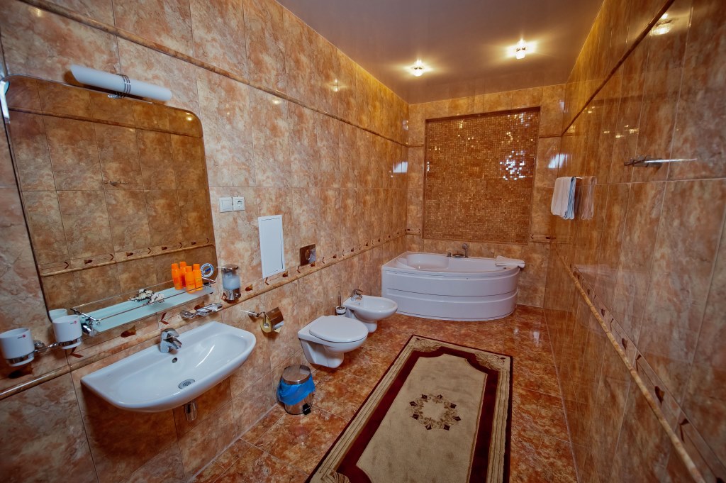 биде; с джакузи; с душевой кабиной; тапочки; туалетные принадлежности; фен; халат;