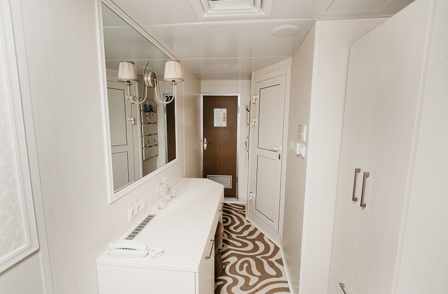 Двухместная каюта, расположенная на средней палубе, со всеми удобствами (раковина, душ, туалет, кондиционер). В каюте: две односпальные кровати, шкаф, стол, зеркало, холодильник, радио, телевизор с кабельным и спутниковым вещанием, фен, розетки 220 V, плед для каждого туриста, щетка для одежды, обзорное окно. В каютах 355 – 360 возможно размещение третьего человека на дополнительном спальном месте верхнего расположения. |