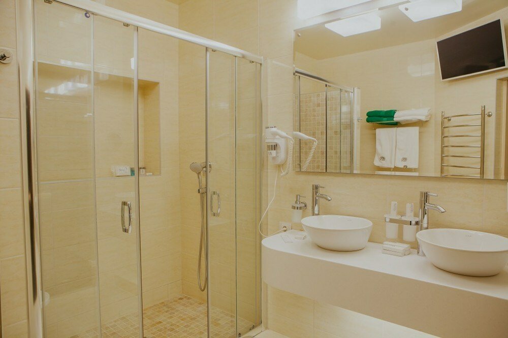 с душевой кабиной: ; тапочки: ; туалетные принадлежности: ; фен: ; халат: ;
