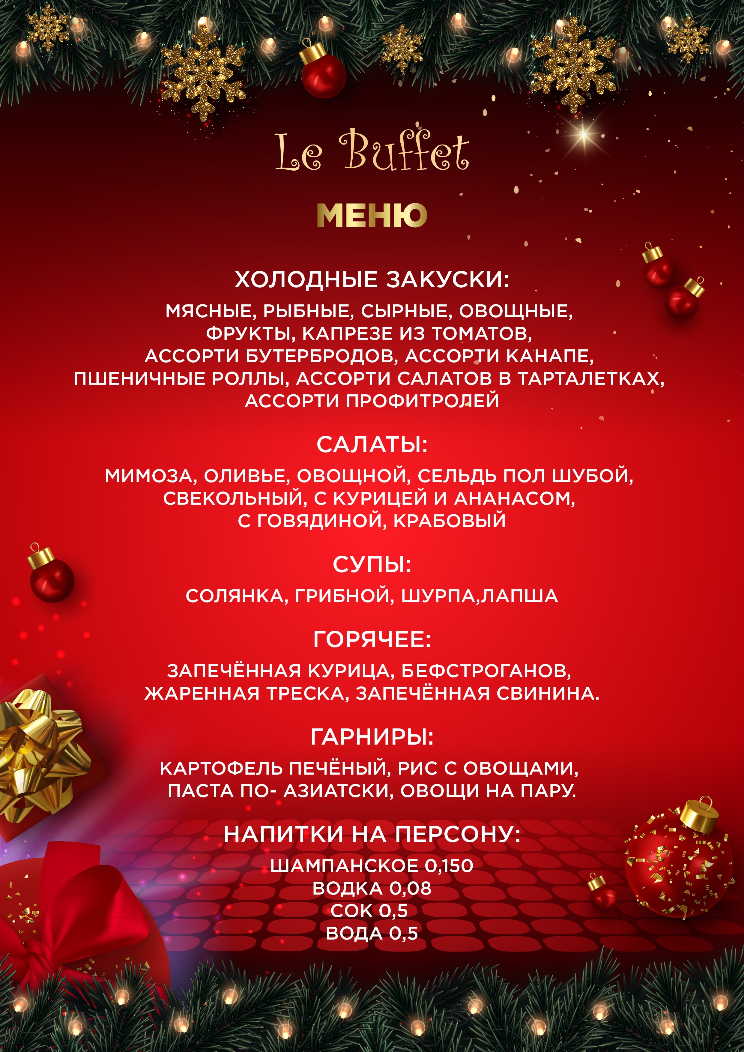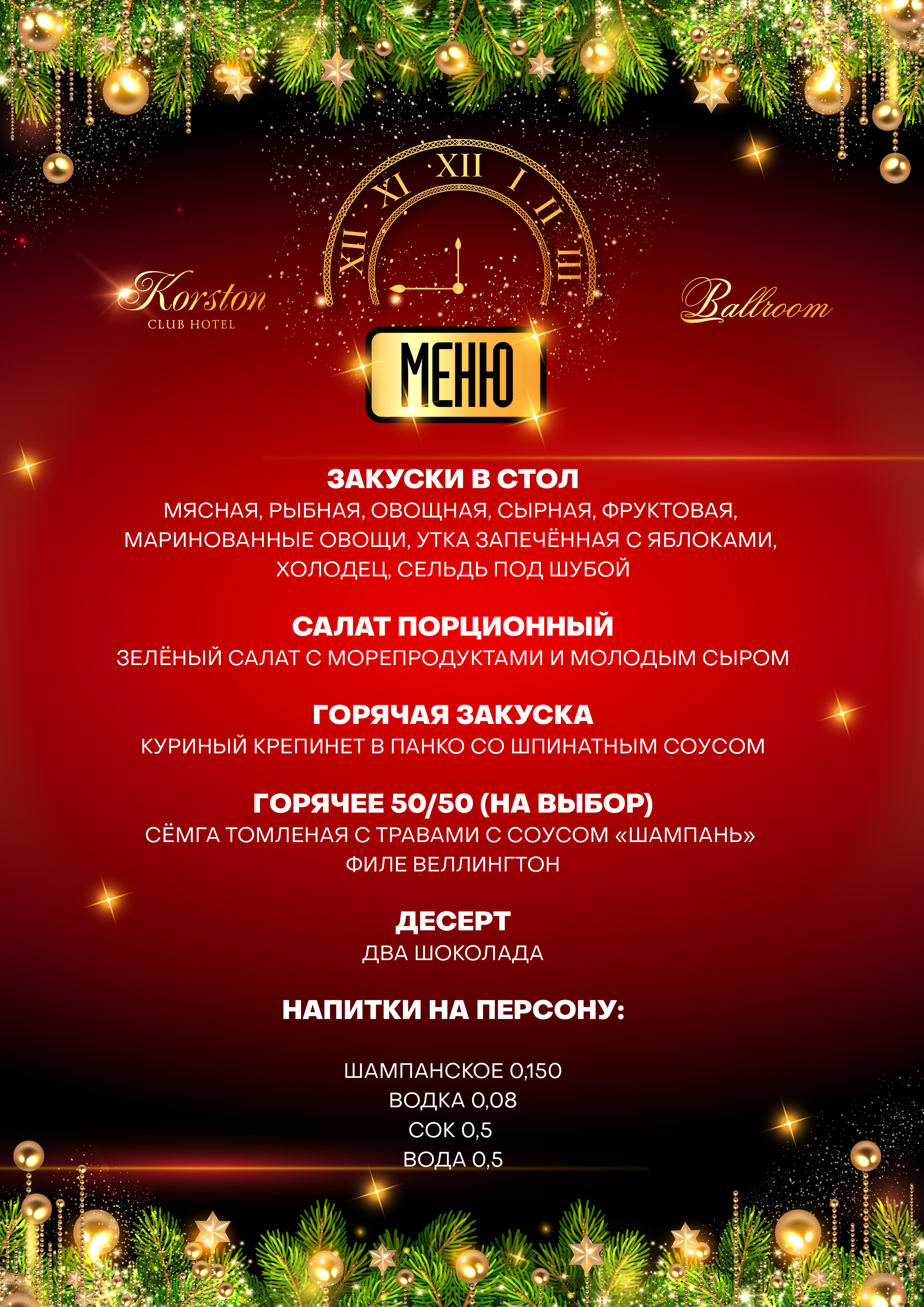 Отель "Корстон" Бальный зал. Яркое шоу для любителей танцев под зажигательные хиты 60-х, 70-х, 80-х, 90-х Позвольте себе почувствовать радость торжества и окунуться в сказку: бокалы с искрящимся шампанским, огни и улыбки, долгожданный бой курантов… Общая тема: кабаре Аудитория: семьи с детьми, молодые семьи. Музыкальное сопровождение: диджей, вокалисты, ВИА, скрипачи. Танцевальное сопровождение: шоу-балет, театр варьете. Интерактивная программа: ведущие, анимация, ходулисты, конек-огонек, Дед Мороз, детская комната, розыгрыш призов, цирковой номер, игра на фужерах. На входе встречают аниматоры в костюмах танцовщиц кабаре, каждому гостю вручают небольшую открыточку с пожеланием. Стоимость: Красная зона - 11000р, Зеленая зона - 8800р, Детский - 5500р Детский билет 3-11 лет, с 12ти лет как взрослый, дети до 3х лет бесплатно без предоставления места. В меню присутствует выбор горячего блюда. |