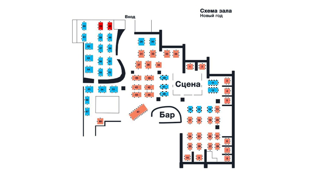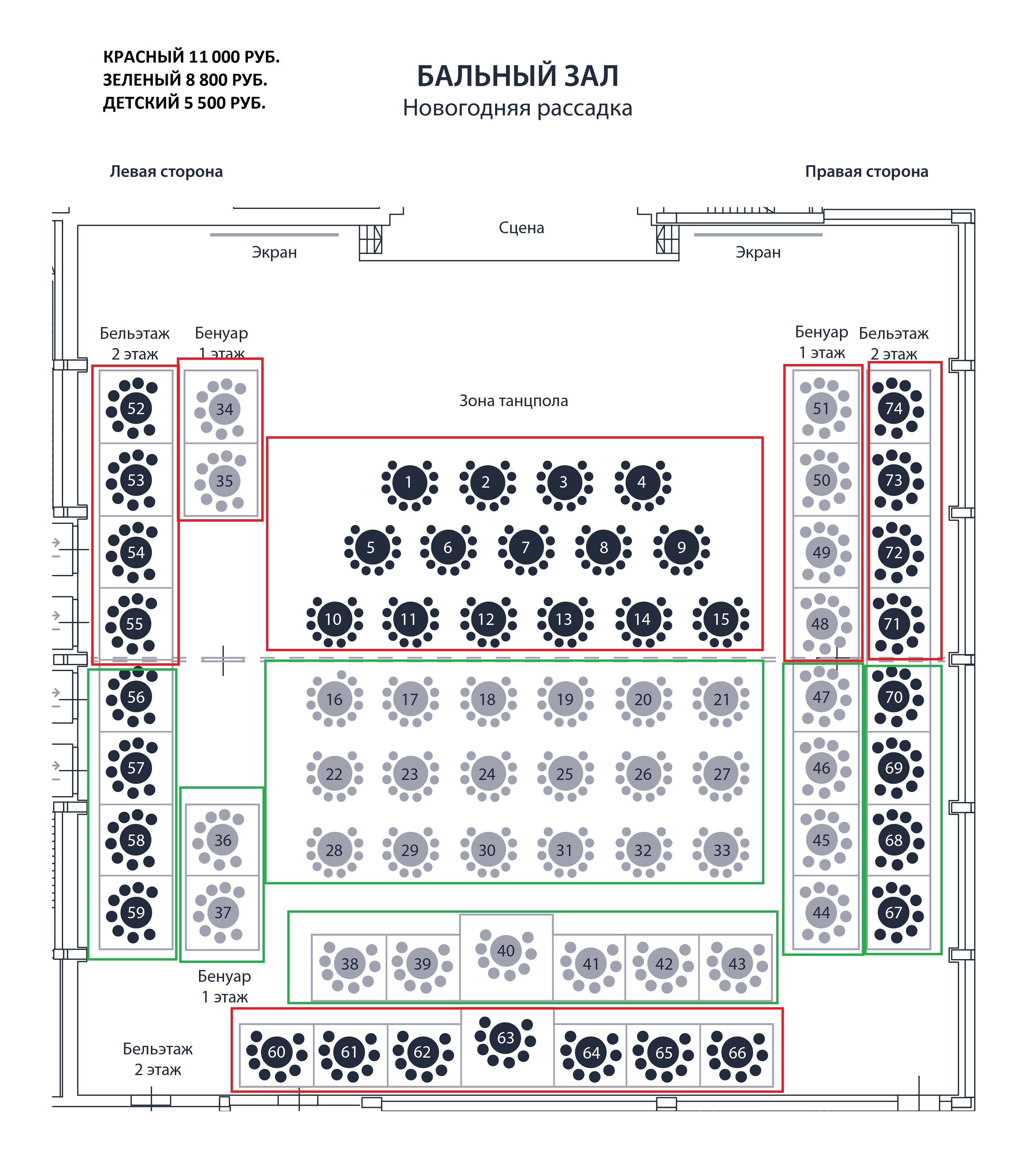 Гостей «АМАКС Сафар отель» ждёт незабываемая атмосфера, увлекательное путешествие в мир дикой природы тропических джунглей, удивительных приключений, неожиданных встреч! Стоимость по схеме: столы № 11, 12, 14, 15, 16, 40, 41, 46 стоимость на 1 гостя 7350 рублей; желтые столы № 1- 10, 13, 17-28, 31- 39, 42-45, 47, 68 стоимость на гостя 5800 рублей; зеленые столы 29-30, 49-58, 60-67 стоимость на гостя 4700 рублей; красные столы 48, 59 стоимость на гостя 3700 рублей. Дети до 3 лет включительно: место за столом без еды - бесплатно, с 3 до 14 лет включительно – 2600 рублей. В меню присутствует выбор горячего блюда.