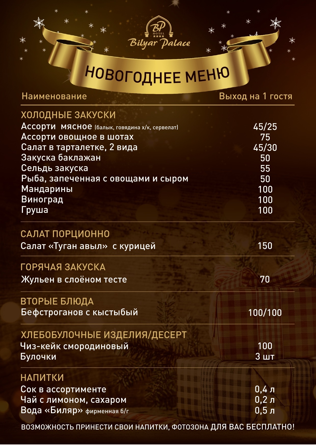 Отель "Биляр Палас отель" Приглашаем Вас встретить яркую Новогоднюю ночь 2022 в ресторане отеля «Биляр Палас». Незабываемая шоу программа включает выступление ведущего, ди-джея, конкурсная программа, танцевальные перерывы с зажигающей музыкой. Стоимость банкета: 7 200 рублей на взрослого с человека. 4 850 рублей дети с 5 до 12 лет включительно с предоставлением места. Ребенок до 4 лет без места бесплатно*. Предварительный запрос на бесплатные места обязателен. |