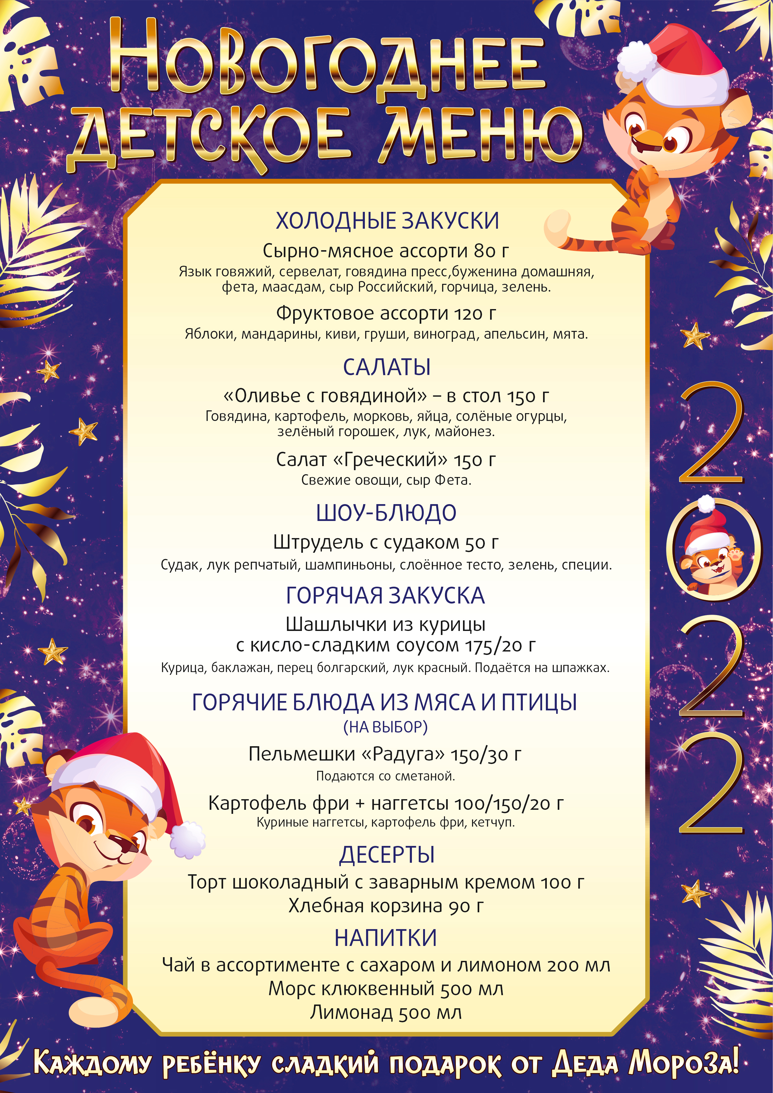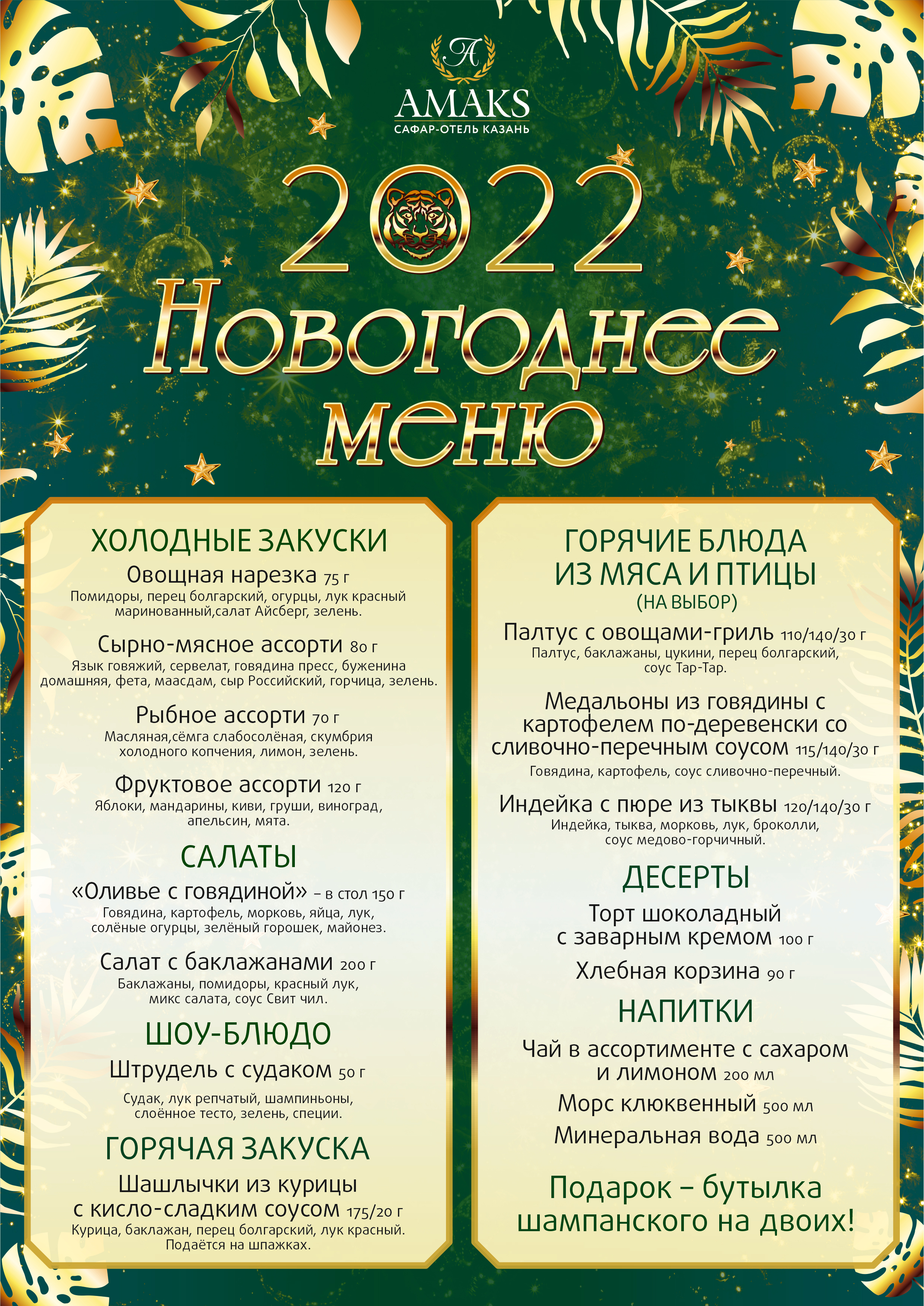 Новогодний банкет Гранд отель Казань. «Целый год за Новый Год» Программа новогодней ночи состоит из маленьких, а иногда и очень больших поводов для праздника. В течении всего лишь одной ночи все гости смогут получить подарок на свой День Рождения, поздравить всех влюбленных с Днем Св. Валентина, принять участие в Первомайской Демонстрации, разыграть друзей в День Дурака, зарядиться бодростью в День Здоровья. Самые любимые всеми календарные праздники, море подарков, веселья, оригинальная развлекательная программа и все это в рамках одной ночи, посвященного встрече Нового 2022 года. Стоимость: Взрослые 7000 руб. (взрослое меню + программа) До 4-х лет бесплатно (без меню) От 4 до 7 лет 1200 руб. (детское меню) От 8 до 12 лет 1500 руб. (детское меню) От 13 до 17 лет 3000 руб. (взрослое меню + программа) |